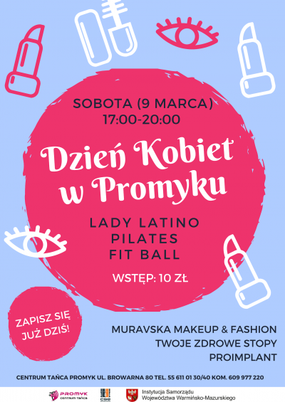 Z okazji Dnia Kobiet Centrum Tańca „Promyk” zaprasza wszystkie fantastyczne panie na kobiecy wieczór, podczas którego będzie można potańczyć, spalić zbędne kalorie, a w przerwach dowiedzieć się co nieco na temat wiosennych stylizacji, poznać wiele makijażowych trików oraz skonsultować się z podologiem i stomatologiem.