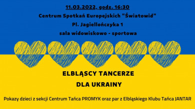Elbląscy tancerze z sekcji działających w Centrum Tańca Promyk i pary z Elbląskiego Klubu Tańca Jantar wystąpią przed zebraną publicznością aby zebrać środki dla osób poszkodowanych w wyniku konfliktu na Ukrainie. Przedsięwzięcie ma charakter charytatywny.