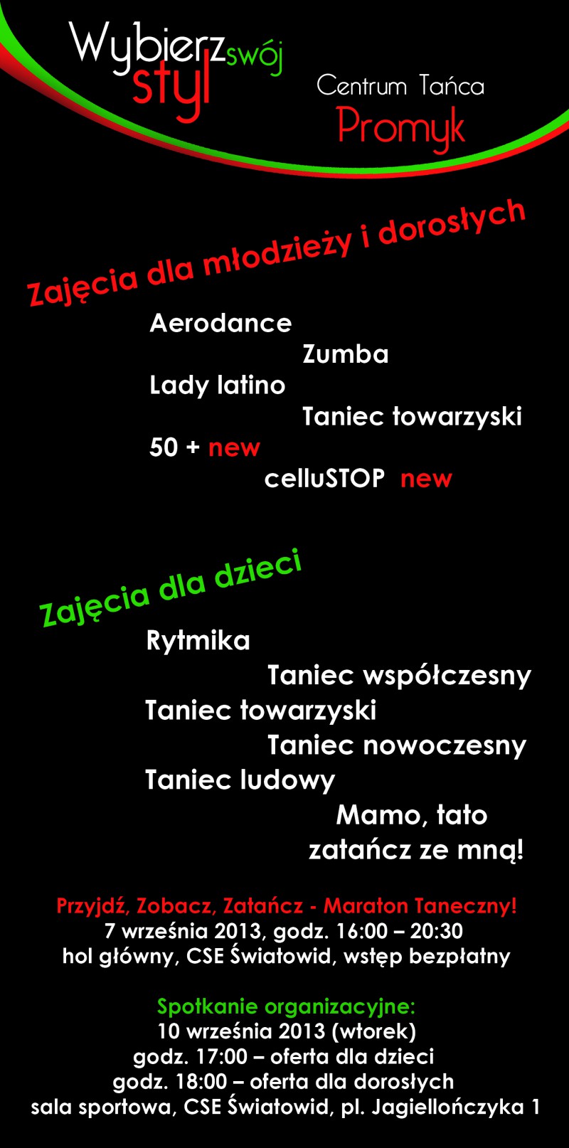 Wszystkich zainteresowanych udziałem w zajęciach tanecznych Centrum Tańca Promyk zaprasza również na spotkanie organizacyjne, które odbędzie się 10 września 2013 w Galerii Nobilis w Centrum Spotkań Europejskich Światowid, w poniższych godzinach.