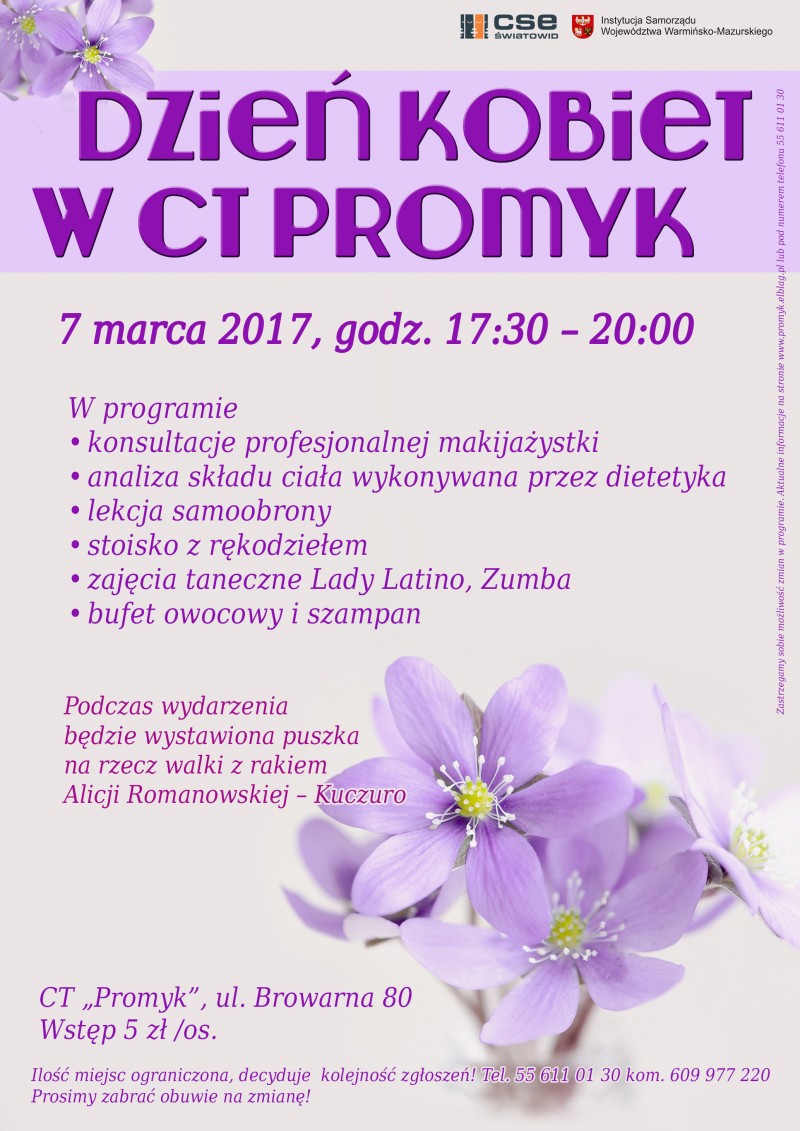 Propozycja, z którą wychodzimy do wszystkich fantastycznych kobiet to aktywne spędzenie tego wyjątkowego święta w naszym Centrum Tańca „Promyk”. Emocji z pewnością nie zabraknie, ponieważ czekać będą na Was zajęcia z samoobrony, lady latino i zumby, a dodatkowo każda Pani będzie miała możliwość wykonać pomiar parametrów ciała. Wszystko za jedyne 5 zł. Cała impreza będzie mieć dodatkowo charakter akcji charytatywnej, na zasadzie koleżeńskiej zbiórki podczas której będziemy wspierać elblążankę w walce z chorobą nowotworową.