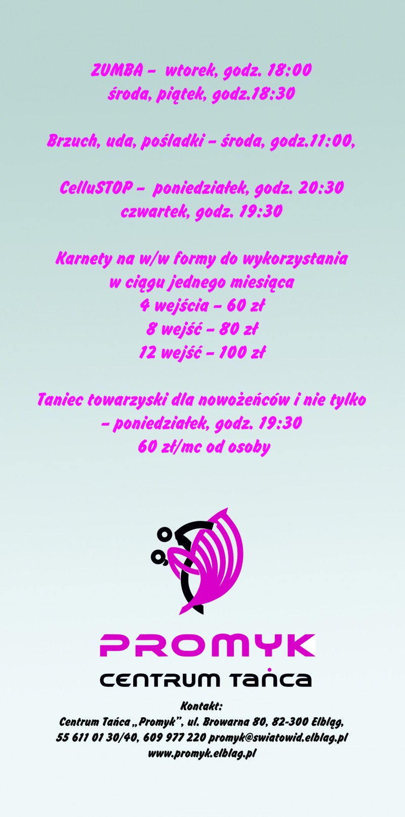 Każdy taniec wspaniale wpływa nie tylko na kondycję fizyczną, ale także na samopoczucie. Tańcząc zapominamy o troskach życia codziennego. Poruszanie się w rytm muzyki działa odprężająco i relaksująco - zachęcają instruktorzy Centrum Tańca „Promyk".